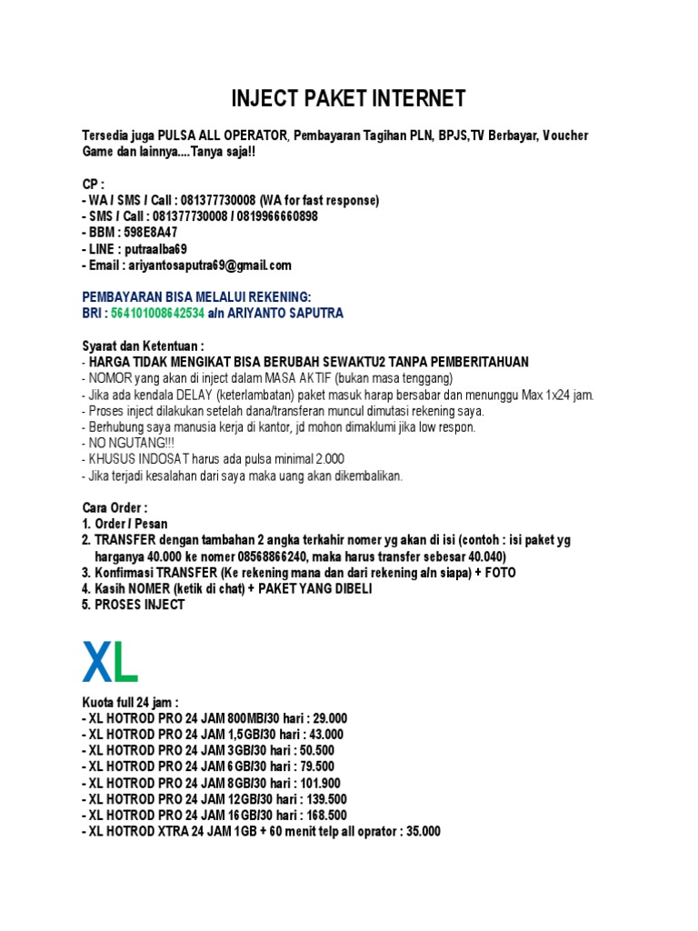 5gb all jaringan 3g/4g +5gb youtube +20menit all operator. Original posted by haburo► gan yg transfer 38001, jangan ragu transaksi sama agan ini proses transaksi sampe aktif paket data ane cuman butuh 5 menit, ini udah termasuk transfer ke bca mantep dah, rec seller banget sekalian. Ssh gratis, inject operator, injek ssh, multi ssh, trik internet gratis. Kami menyediakan inject untuk paket internet anda. Memulai bisnis paket bb dan kuota bisa tanpa modal.